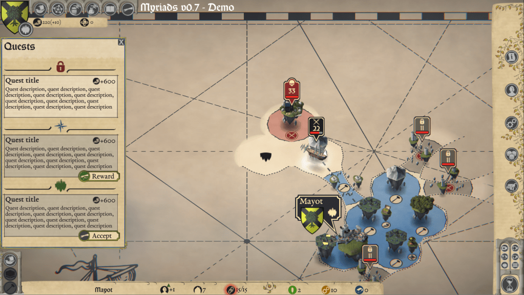 As our game is divided into 2 parts, the city-builder and the worldmap, and these 2 parts are supposed to be played in parallel, the tutorial quests will be divided in the same way. There will never be 2 quests of the same type available at the same time to avoid the player’s mind to lose focus. Hence, at any time, there will always be, at best, 3 quests ongoing for the player: main, city-builder related and worldmap related.